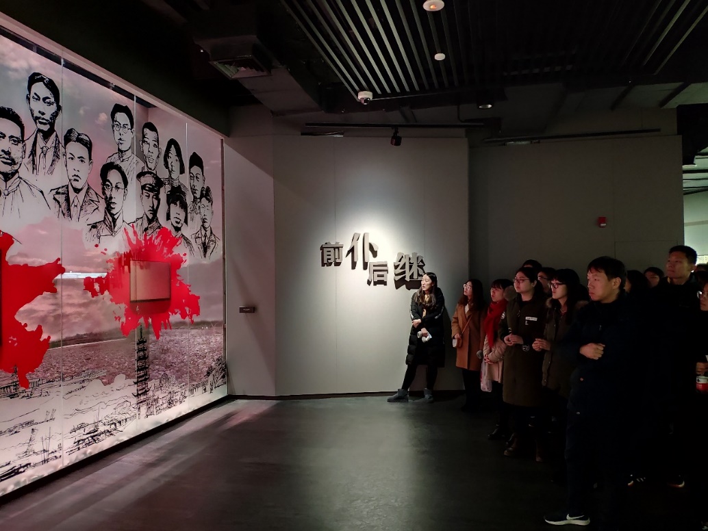 献花仪式结束后,大家一起走进了龙华烈士纪念馆,依次参观了“信仰的召唤” “使命的执着” “信念的坚守” “民族的脊梁” “胜利的奋争” “时代的先锋”等主题展,仔细聆听讲解员计算机研究生第四支部党员孟伟强同志对256位英雄人物的生平事迹以及相关照片、实物和艺术品细致讲解,让老师同学们深切体会到“英雄之城孕育英雄,英雄精神激励后人”的展览主线,其中二十四烈士多媒体剧场采用雕塑、光影、音乐、舞蹈、朗诵等手法将龙华二十四烈士生动再现,演绎英烈们由生而死,死而永生的感人故事,深深的打动了参观的同志们。最后老师同学们参观了遗址即烈士们的就义地,昏暗潮湿的看守所,让人看不到天空的高墙,那里曾是血腥的刑场,无数先烈和爱国志士抱着“杀生成仁,舍生取义”的情怀英勇就义。
